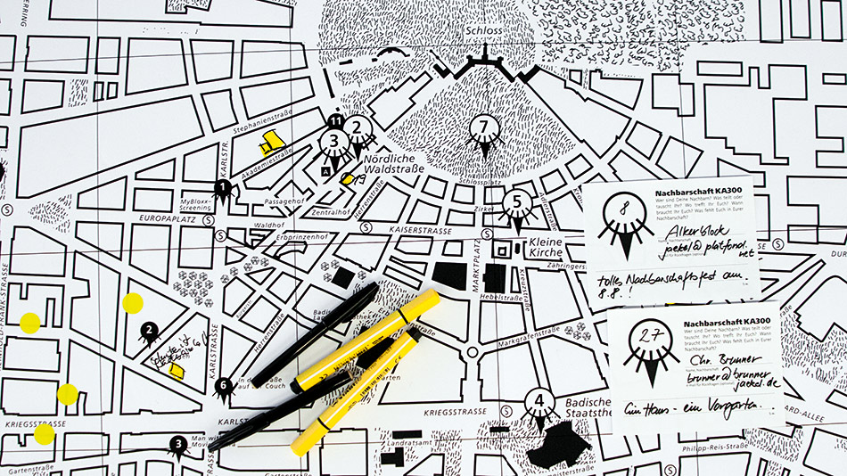 Kartenmaterial für die Veranstaltung »Stadtleuchten« zum 300. Stadtjubiläum von Karlsruhe. Auftraggeber: platfond, Karlsruhe/ Berlin