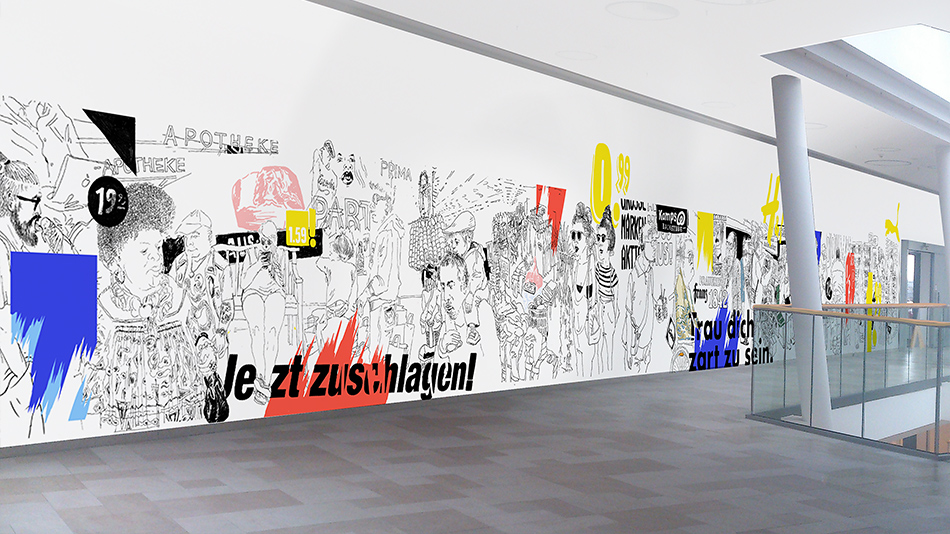 Deutschlandweit nahmen jeweils zwei Absolventen einer Kunsthochschule teil. Detailreiche Zeichnungen dokumentieren Konsumwelten, Werbesprüche werden in neue Kontexte gebracht.